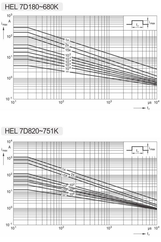 14D滿足20D的 脈沖性能要求 14D instead of 20D 舉例2 Example HEL14D561KX能達到 6KV/3KA 100次 HEL14D561KX reach 6KV/3KA 100 times? |